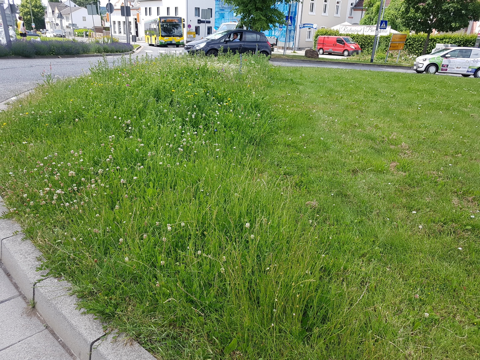 Die städtischen Gärtner haben mehr Aufwand und müssen mit ihren Mähmaschinen den Wildblumenbestand vorsichtig umrunden. Die Bienen, Hummeln, Schmetterlinge und andere Insekten danken es ihnen und finden auf den Blumeninseln ein reiches Nahrungsangebot.